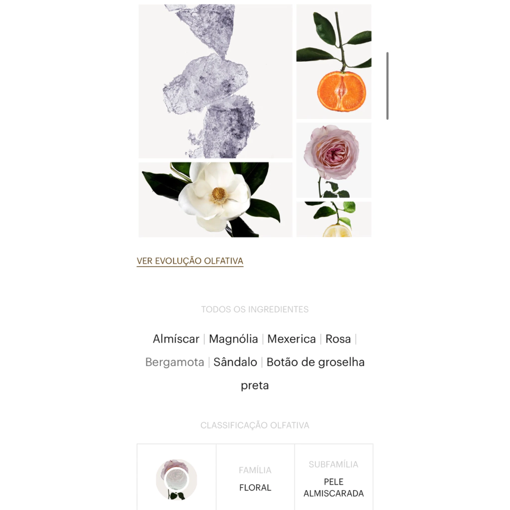 NOTAS: Bergamota, Mandarina, Magnólia Branca, Cassis, Sândalo Branco. Almíscar Branco, Almíscar Rosa.